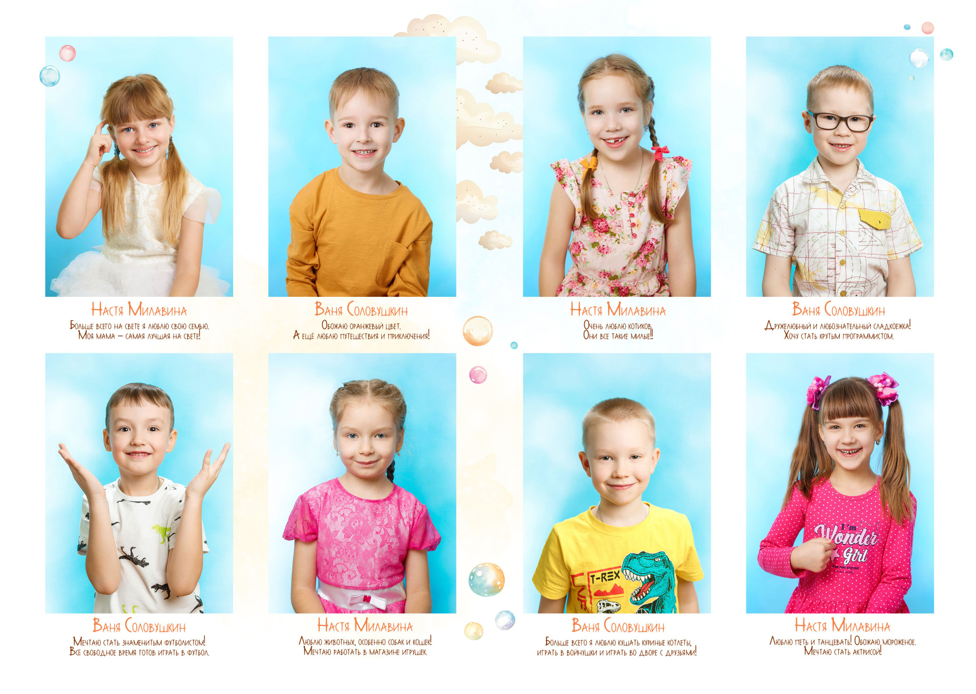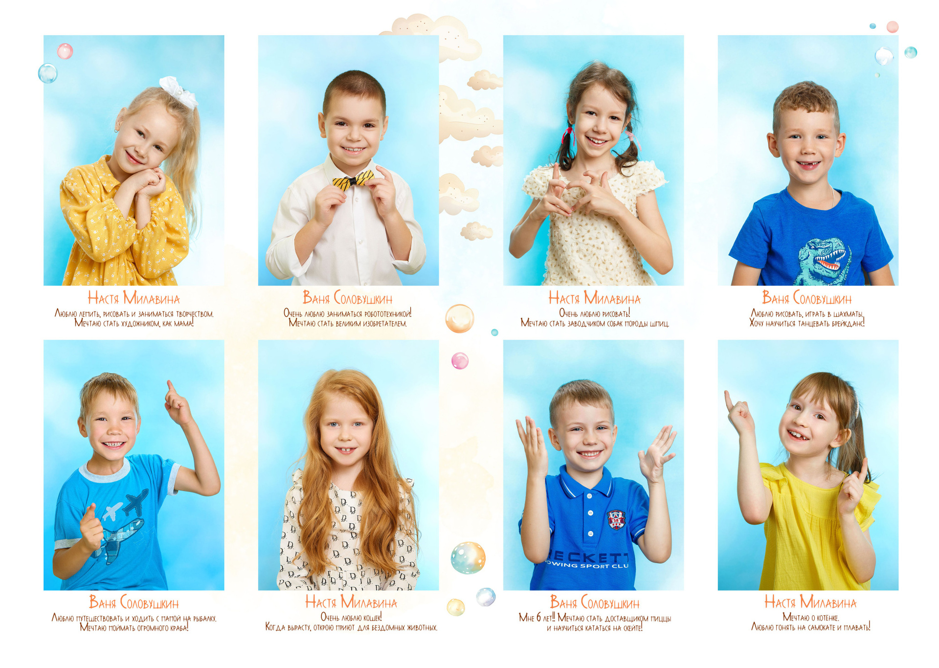 - у каждого ребёнка есть слова о любимых занятиях и мечтах
